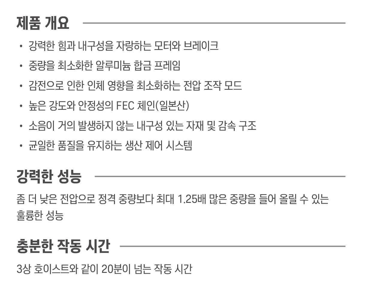 - 충분한 작동 시간 : 3상 호이스트와 같이 20분이 넘는 작동시간
